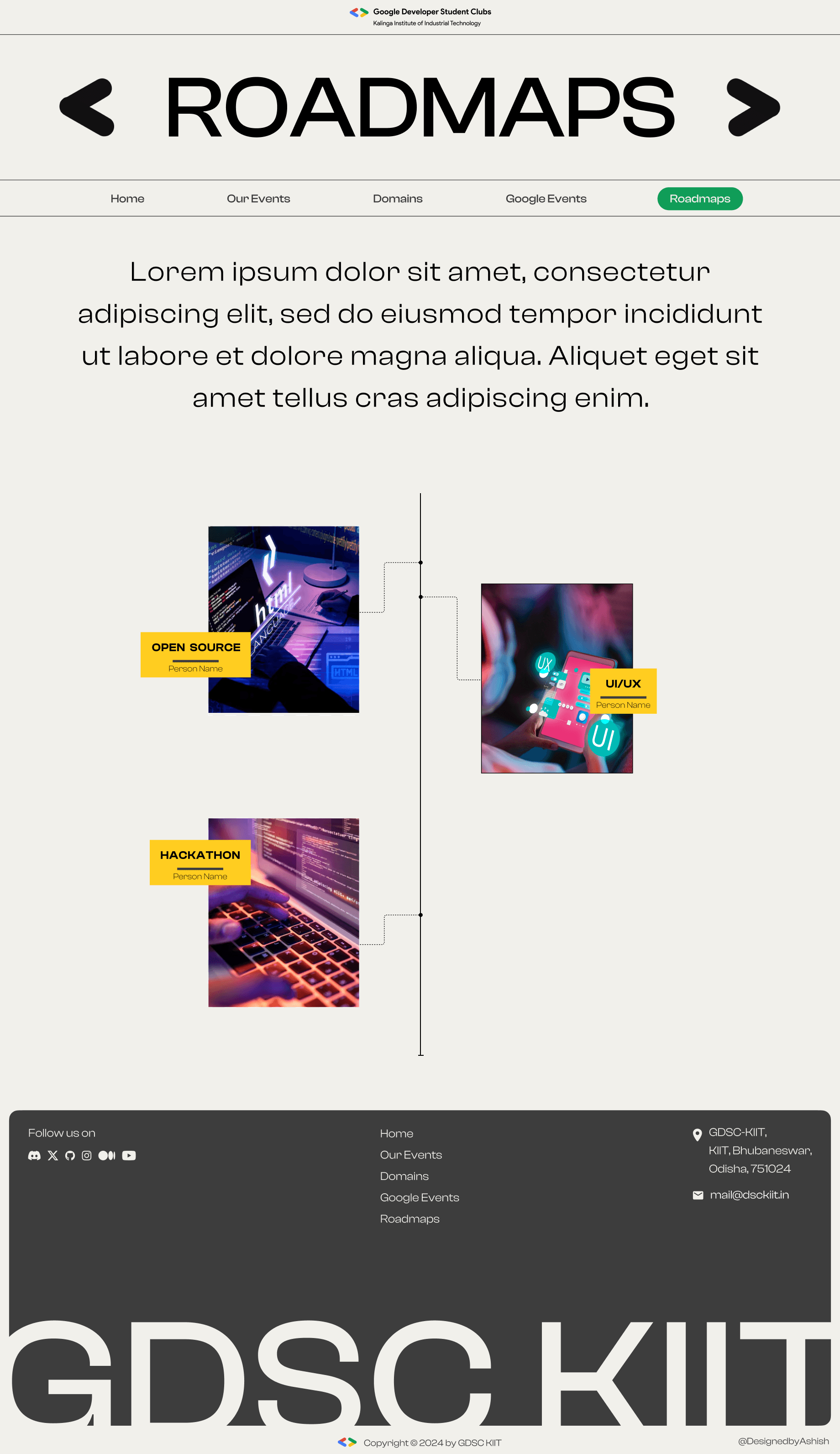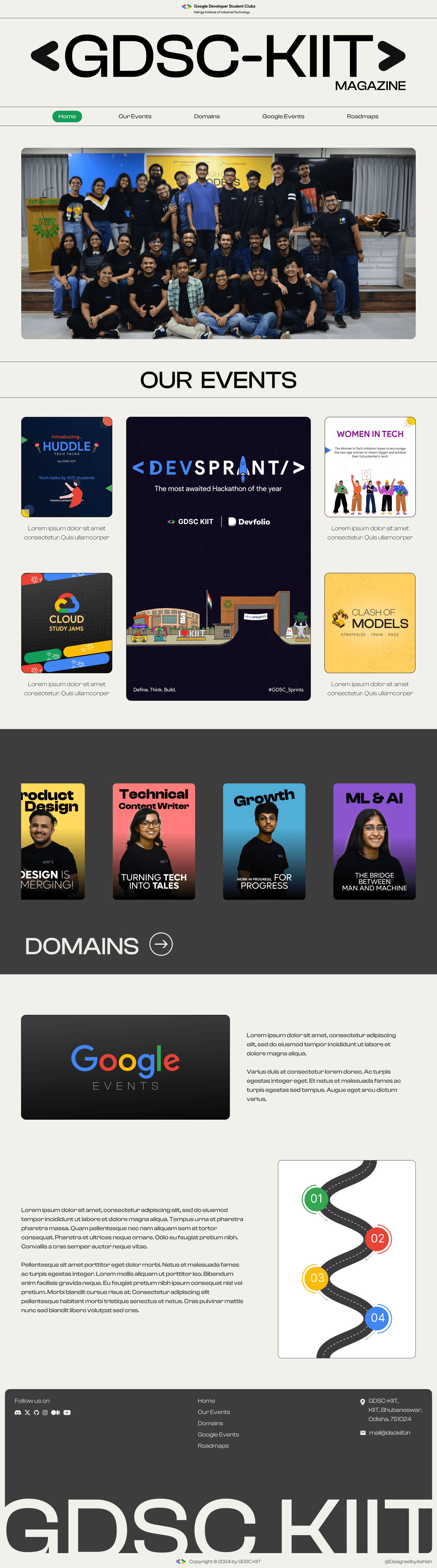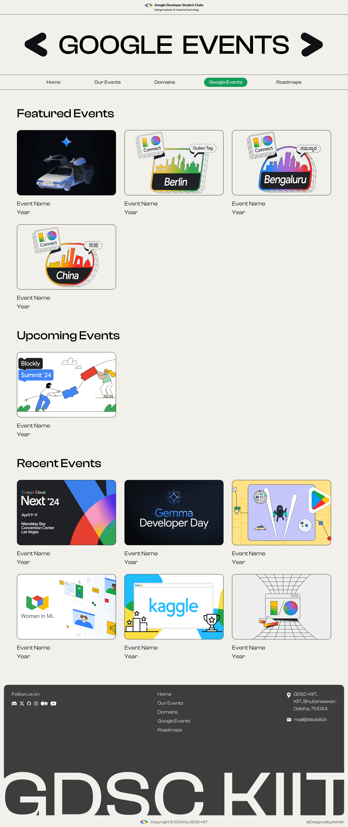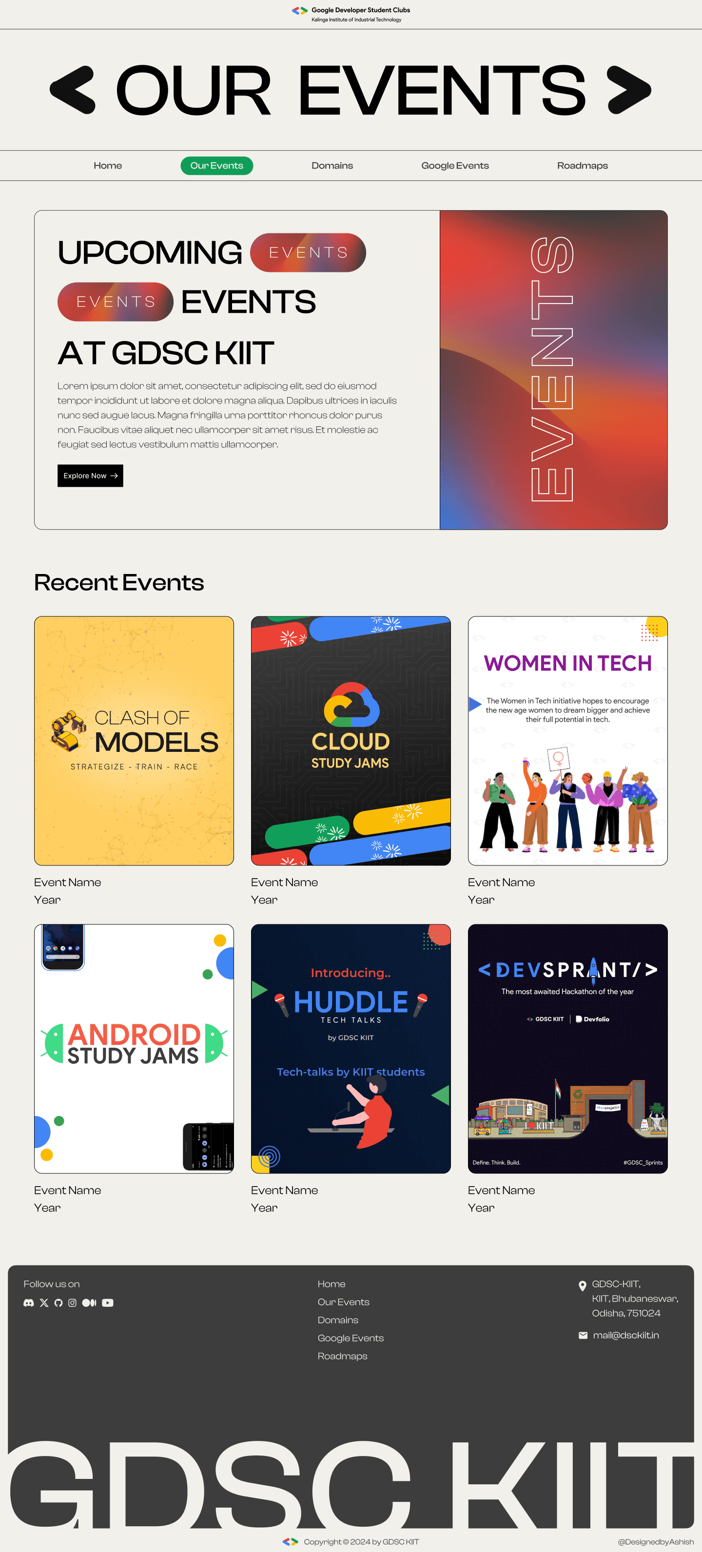 A club is defined by what they do, thus to represent them, I chose to focus on their past and upcoming events. I wanted to create a page where users could interact and learn about GDSC KIIT.